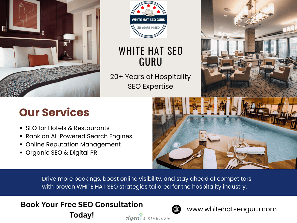 At White Hat SEO Guru, we believe hospitality brands deserve more than just traffic—they deserve loyal guests. As an award-winning SEO company, we craft strategies that help hotels, resorts, and restaurants turn online searches into real bookings. Our focus goes beyond rankings: we build visibility, credibility, and guest trust. With 2000+ clients worldwide, we’ve proven that ethical, white-hat SEO can fuel long-term growth in the hospitality sector. From boosting local presence to enhancing online reputation, our tailored solutions empower businesses to thrive in today’s competitive travel and dining landscape.